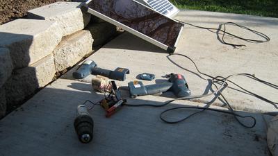 Okay I admit I already have a feasible power source for charging the batteries, but am debating on which to use. I have a few solar panels, a 5W amorphous, 10W crystalline and a small household battery charger type. I'll use the small one toggle a relay that provides power to the motor. Unlike the crystalline type, the amorphous panel will still output some power even when partially blocked to maintain charging the batteries.