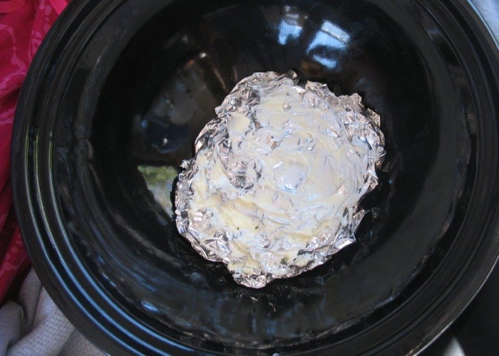 Make a ‘disc’ of foil to set in the bottom of the Hot Pot, thereby making the Pot ‘flat-ish’ on the bottom; heavily grease disc with butter.